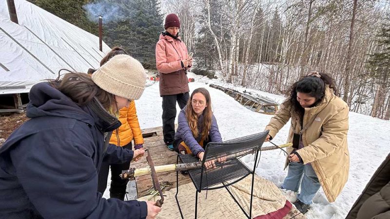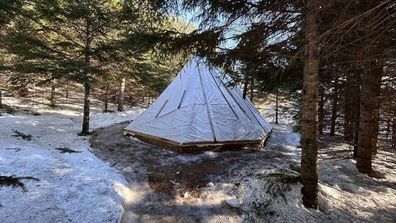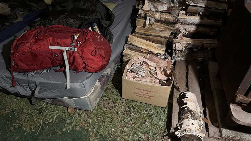 « Pour isoler le sol, un bon tas de branches de conifères sous le matelas est une technique ancestrale. Les jeunes se relaient pour chauffer au bois la nuit », raconte-t-il en souriant, car il se rappelle les expressions émerveillées des jeunes qui expérimentent pour la première fois ce type de lit dans un environnement typiquement innu.